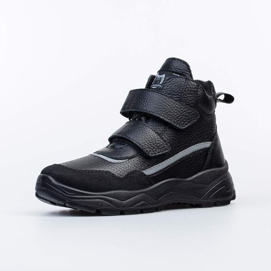 Черные кожаные ботинки для мальчика-подростка имеют классический крой и неубиваемые детали. Верх выполнен из натуральной кожи черного цвета. На носу антивандальная накладка. Светлые вставки имеют светоотражающий эффект для безопасности в темное время суток. На языке пришивной лейбл с молодёжной надписью. Подкладка из байки (больше 80% натуральная овечья шерсть) и войлочная стелька хорошо сохраняют тепло. Внутри защита пятки от истирания — кожаная накладка поверх утеплителя.