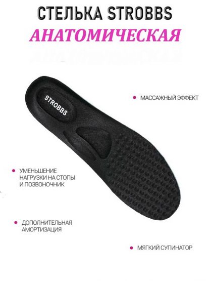Анатомическая стелька с мягким рельефом распределяет нагрузку между всеми частями стопы, чтобы предотвратить усталость в ногах и возможность появления дискомфорта.